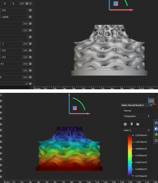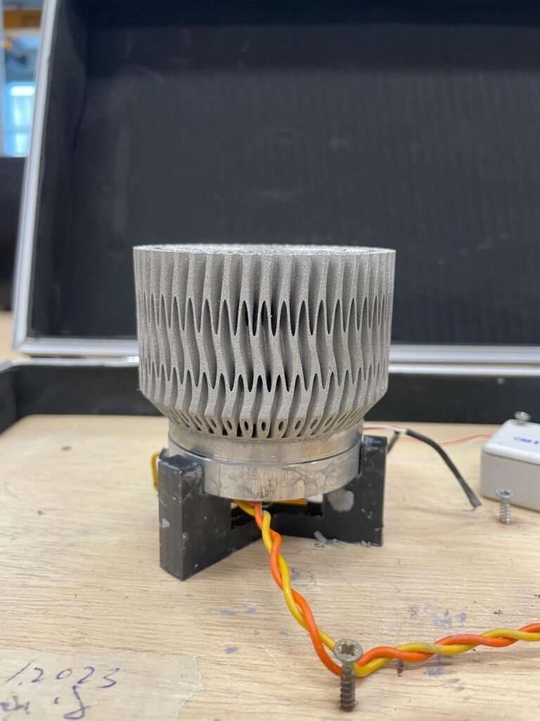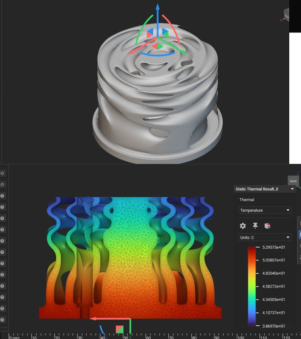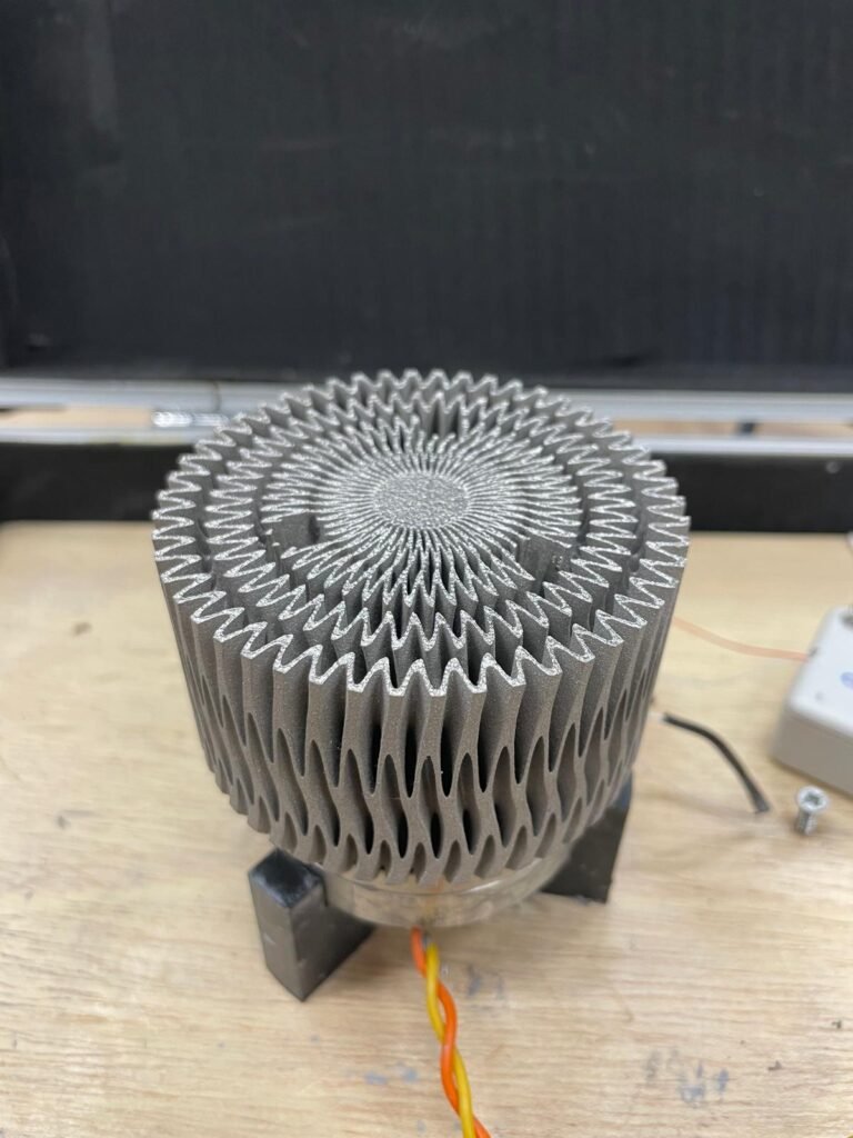 This project explored innovative heat sink designs to enhance thermal dissipation for electronic applications. Multiple iterations of the heat sink were simulated and refined using nTopology to identify the most effective gyroid geometry. The final design was metal 3D-printed in stainless steel—the only available printer material—within a maximum print volume of 100 cm³. Physical testing confirmed effective thermal management, with a maximum core temperature of 65.7 °C. This investigation demonstrates the potential of complex lattice structures and iterative design processes to create more efficient heat sinks for electronics using additive manufacturing