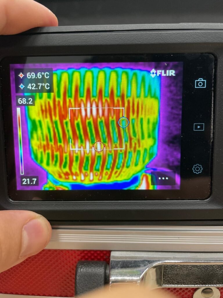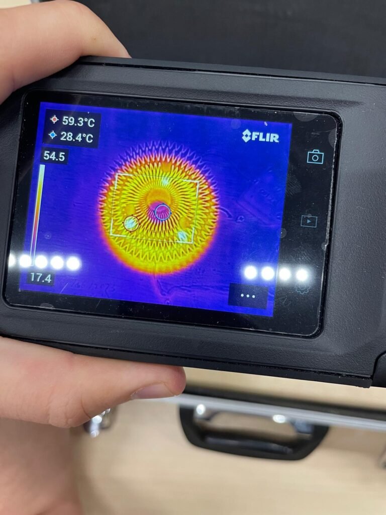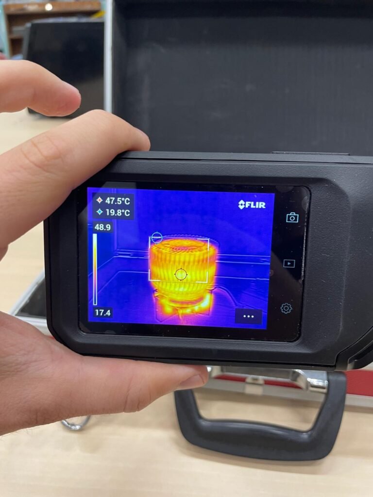 The thermal performance of the heat sink was evaluated using a dedicated test rig. A 10 W resistor served as the heat source, and a temperature sensor was positioned at the core of the test rig base to monitor the heat conducted through the heat sink. Additionally, IR cameras were employed to measure surface temperatures across the heat sink. Tests were conducted at an ambient temperature of 21 °C, and measurements were recorded once steady-state conditions were reached. To ensure good thermal contact, thermal paste was applied between the heat sink and the test rig base, and the assembly was secured using three screws. This setup allowed for accurate assessment of the heat sink’s ability to dissipate heat under controlled conditions.