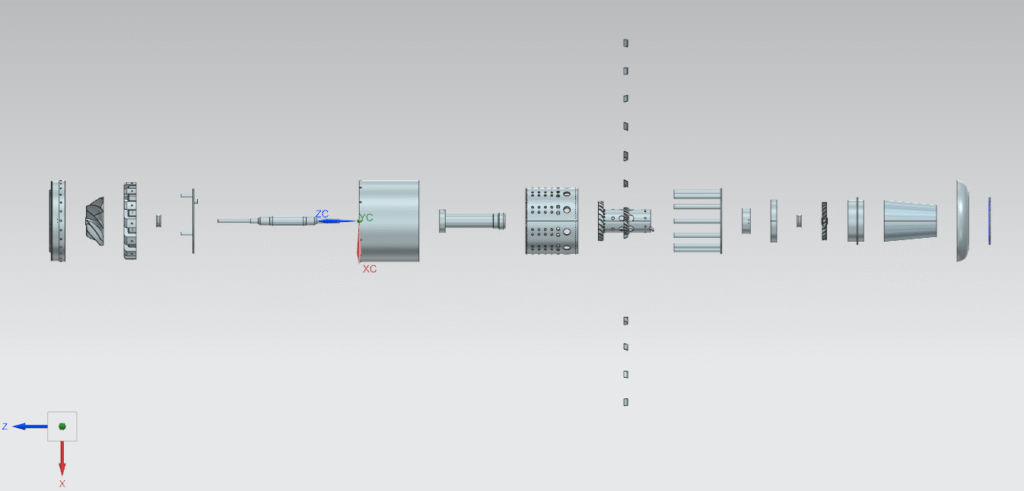 To validate the manufacturability of the jet engine design, a complete prototype was produced using plastic 3D printing. This stage served to physically verify the sizing, fit, and tolerances of all components before committing to metal fabrication. The printed parts confirmed that the assembly aligned as intended, with each piece meeting the required dimensional accuracy. By ensuring that no adjustments were necessary, the 3D prototype provided confidence in the CAD design and reduced the risk of errors in subsequent machining processes.