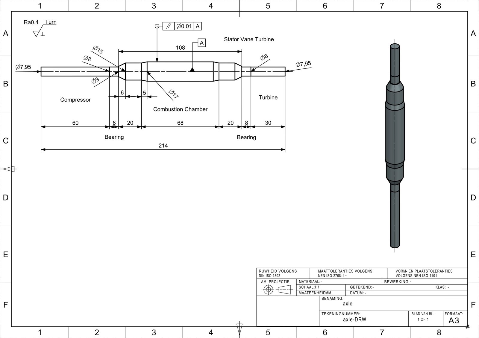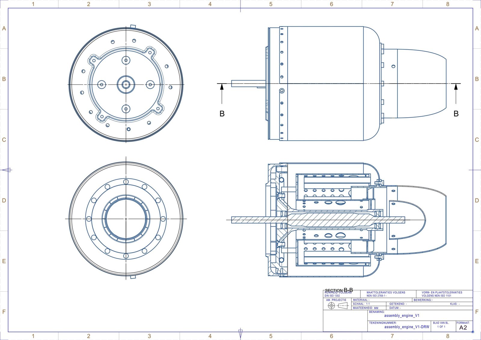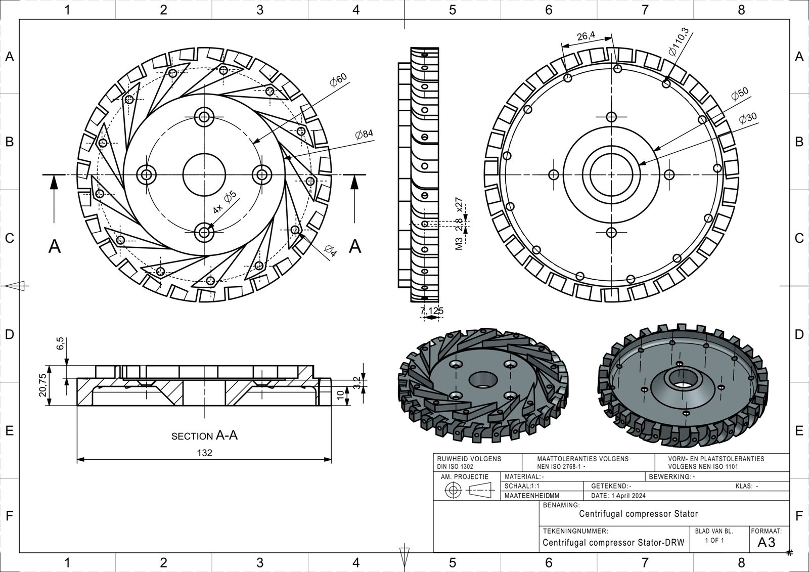 The sequence begins with the full assembly of the jet engine, followed by detailed drawings of the key subsystems and parts: the compressor stator, combustion chamber, axle, axle cover, outer casing, and compressor stator cap. Together, these documents provide the foundation for precision manufacturing and serve as the link between digital design and physical realization. Only some Technical Drawings from the components are shown below.