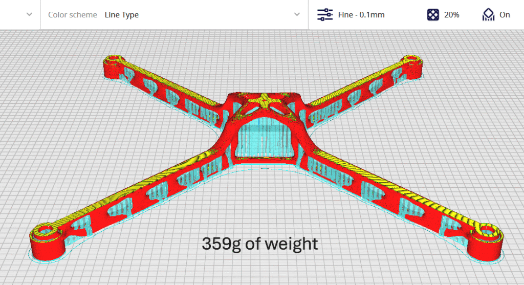 To prepare the optimized frame for fabrication, the facet body generated from the topology optimization was first converted into a convergent body and then exported as a high-quality STL file by reducing both the chordal and angular tolerances. This ensured that the complex geometry was accurately captured for printing. The STL was then transferred into slicer software, where printer settings and part orientation were defined. Figure 8 shows the sliced view of the optimized frame, where all regions except the light blue are structural material, and the light blue indicates support structures required for overhangs. The total print weight, including supports, was calculated at 359 g. A 20% infill density was selected using a gyroid pattern, chosen for its isotropic mechanical behavior, which provides consistent stiffness in all directions while further reducing unnecessary mass.
