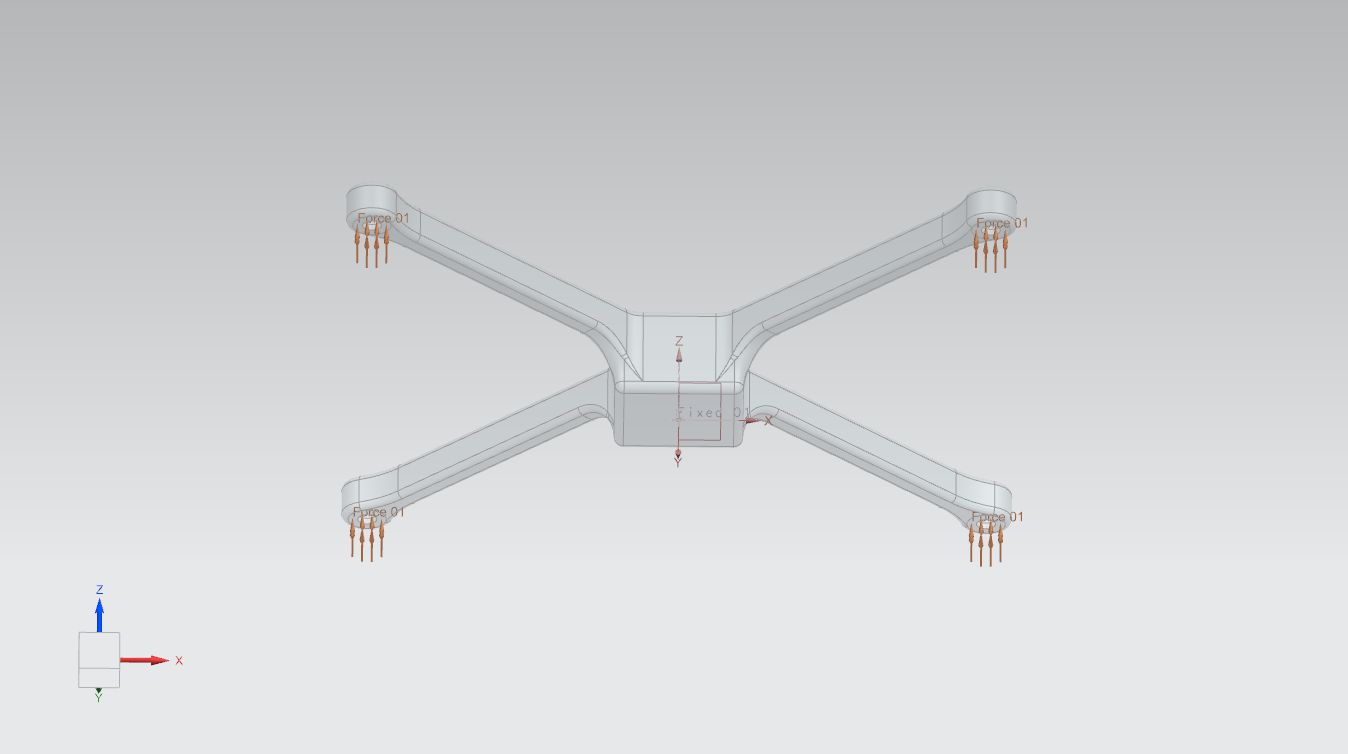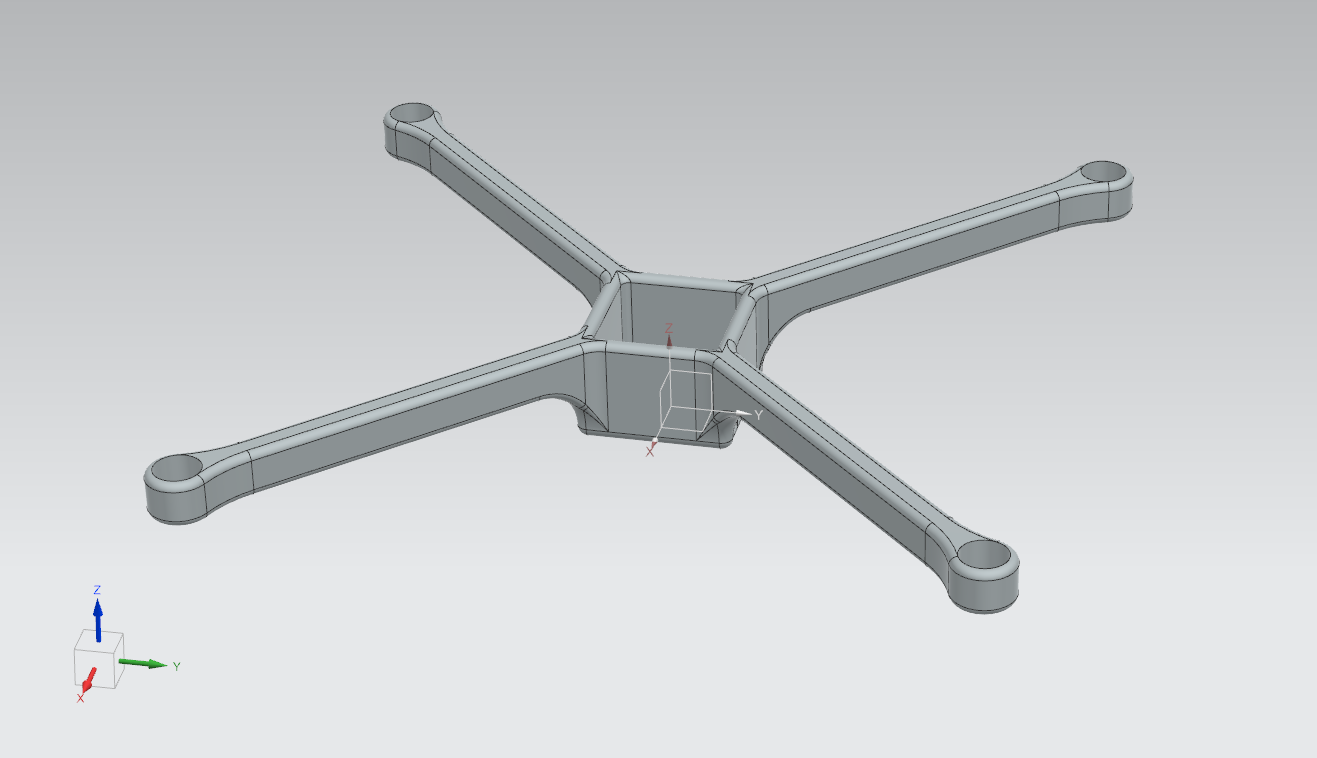 This project explored the design of a lightweight quadcopter frame through topology optimization, with the objective of extending flight endurance by reducing structural weight. Using Siemens NX’s topology optimization environment, loads were applied at the motor locations and small fixed constraints were introduced to approximate an ideal hovering condition. The optimization process achieved a weight reduction of roughly 50% while maintaining high stiffness throughout the structure, demonstrating the potential of advanced computational design for UAV applications.