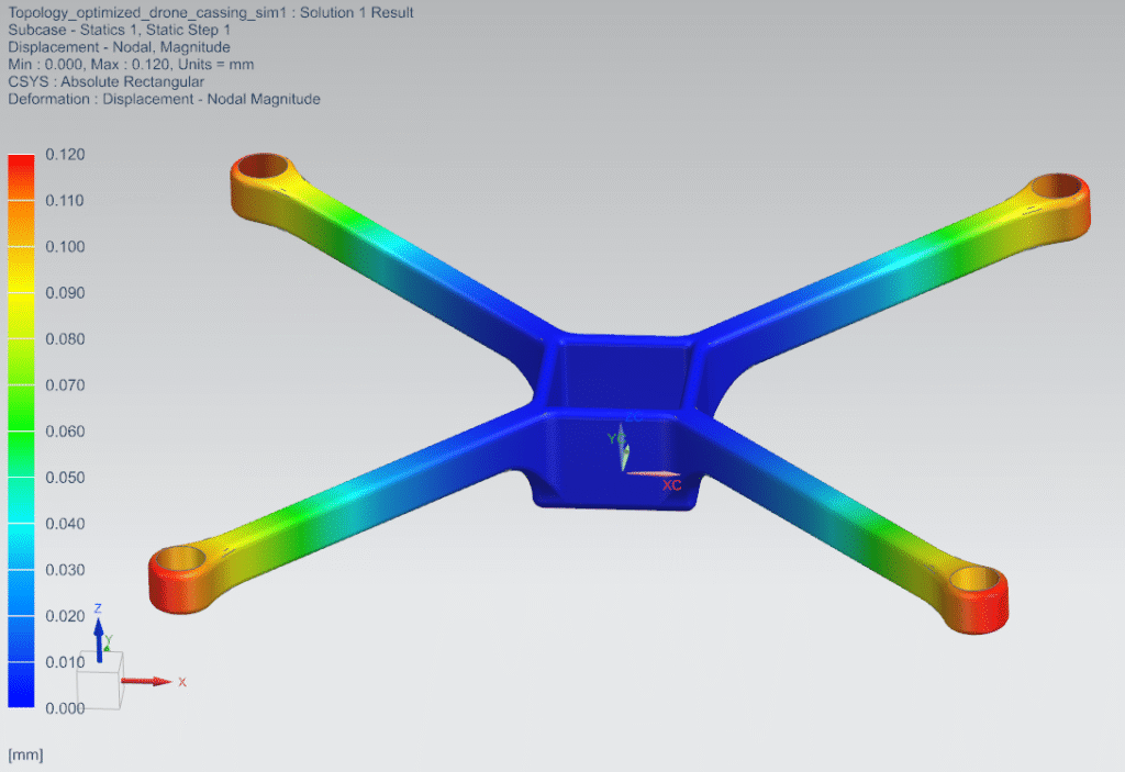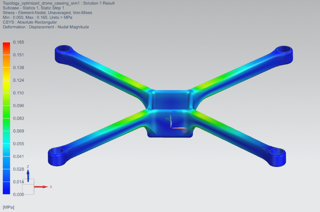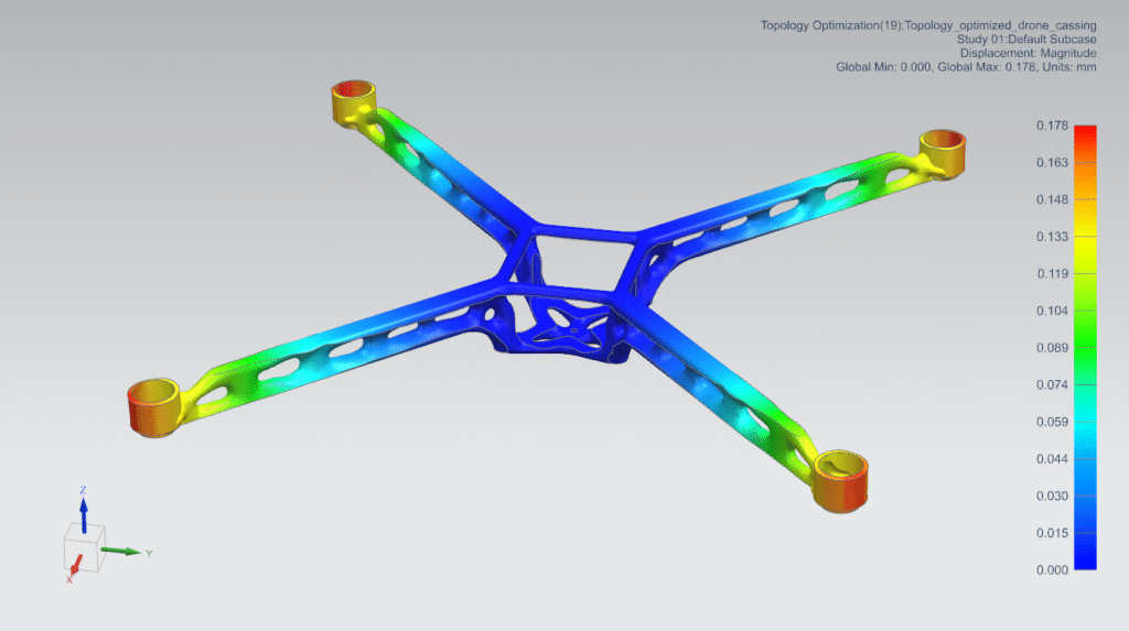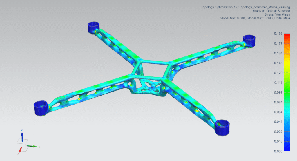 The optimization process delivered a highly efficient drone frame design, cutting overall weight by nearly 50% while preserving the stiffness required for stable flight. The resulting structure showcased the power of computational design to uncover material-efficient geometries that would be difficult to achieve through conventional methods. By reducing mass so significantly, the optimized frame directly supports extended battery life and longer flight times, addressing one of the most critical limitations in drone performance. Beyond the numerical improvements, the outcome highlights how topology optimization can unlock lightweight, structurally robust solutions that push the boundaries of UAV design.